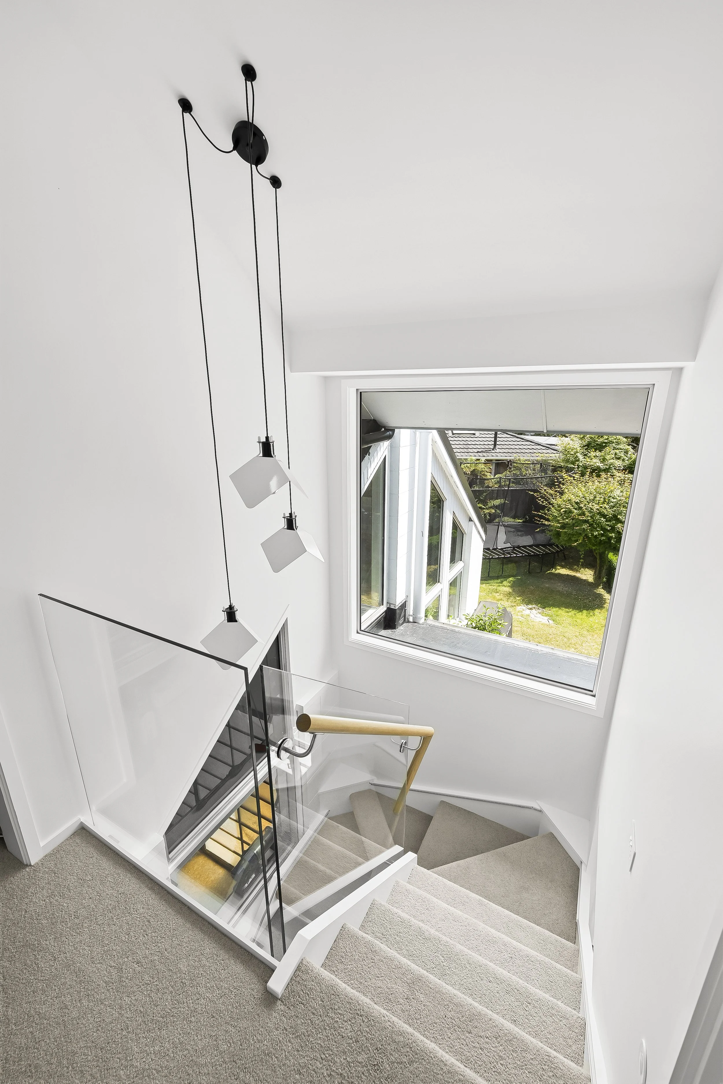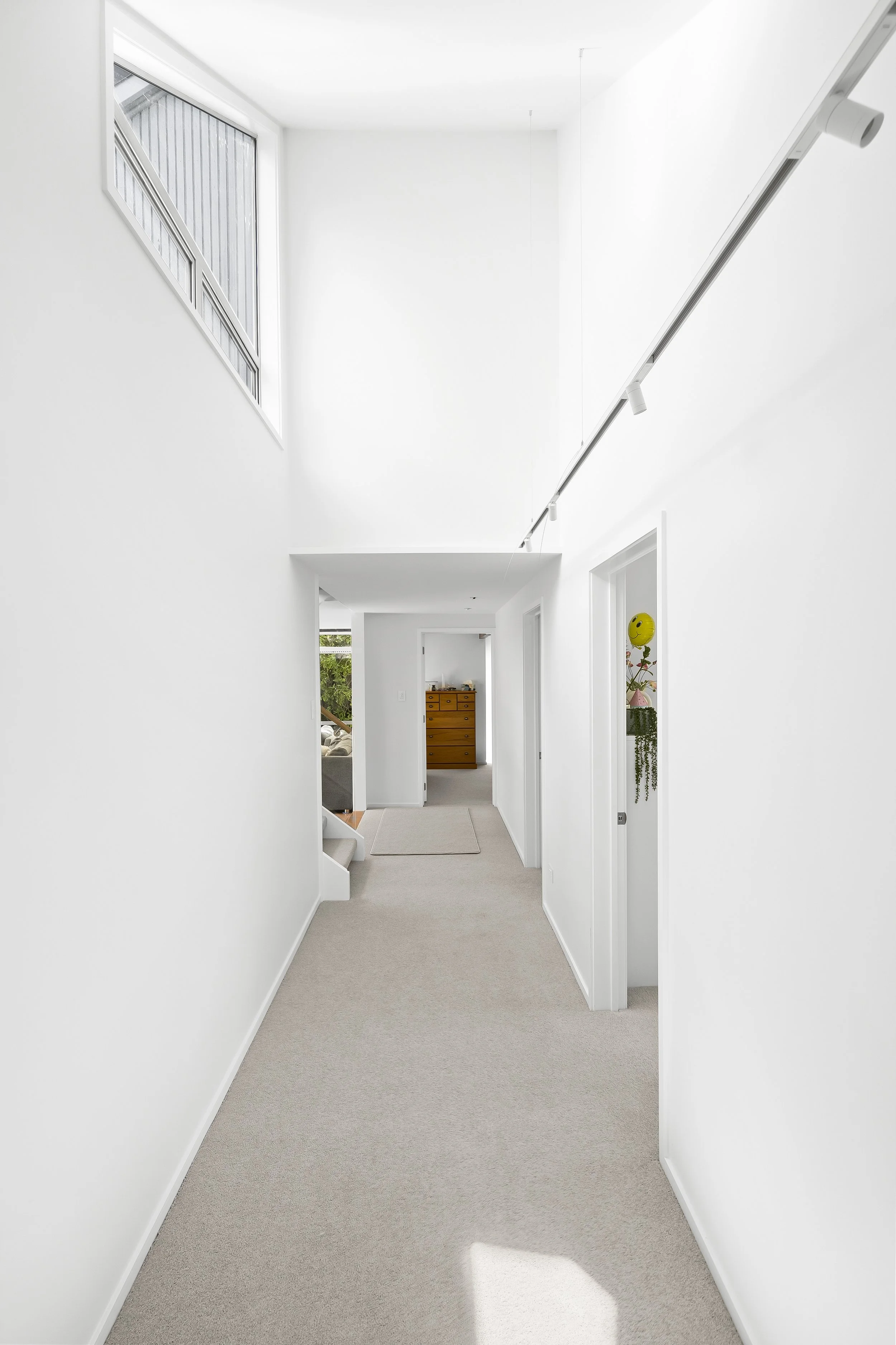 This project called for a simple outcome - clean, modern, and restrained - so as not to detract from the complex architectural nature of the home. Completed prior to the client moving in, the property had already undergone extensive renovations. This created a unique mix of old and new elements, including existing varnished louvres and trim, alongside newly constructed spaces with 4.2-metre raked and angled ceilings spanning much of the home. Lighting played a significant role in this project, with natural light spanning and reflecting across walls, ceilings, and timber features from multiple angles. This made preparation especially important, as even minor imperfections would be highlighted under these conditions. To complement the architecture, we utilised a cohesive colour palette with subtle variations in sheen and finish. This approach allowed us to enhance the depth and detail of the space without overshadowing the already impressive design and craftsmanship.